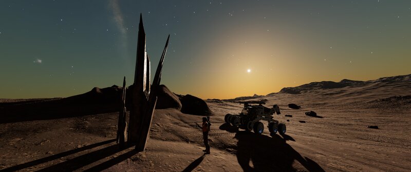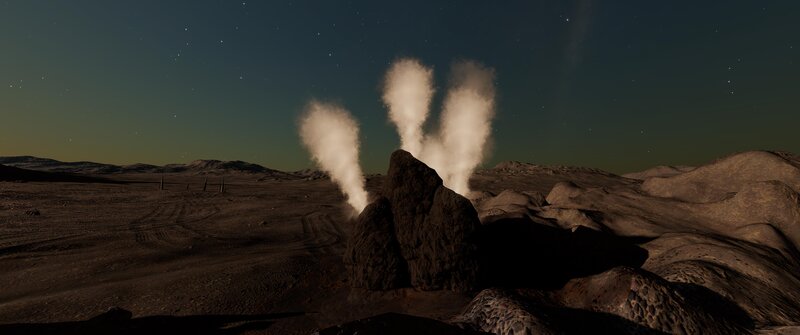 Auphaibs OY-Y d1-21 B 1, named Jino's Spires in memory the discoverer's late brother, is a high metal content planet in the Formorian Frontier, with a carbon dioxide atmosphere, a gravity of 1.23 g, and an average temperature of 253 K - and surface life: Crystalline shards with polonium are present on the planet. On the planet you can also find silicate magmal ava spouts: and silicate vapour fumaroles: The light of the class A star shining through the carbon dioxide atmosphere can create picturesque views. | → | Auphaibs OY-Y d1-21 B 1, named Jino's Spires in memory the discoverer's late brother, is a high metal content planet in the Formorian Frontier, with a carbon dioxide atmosphere, a gravity of 1.23 g, and an average temperature of 253 K - and surface life: Crystalline shards with polonium are present on the planet. On the planet you can also find silicate magma lava spouts, and silicate vapour fumaroles: The light of the class A star shining through the carbon dioxide atmosphere can create picturesque views. |