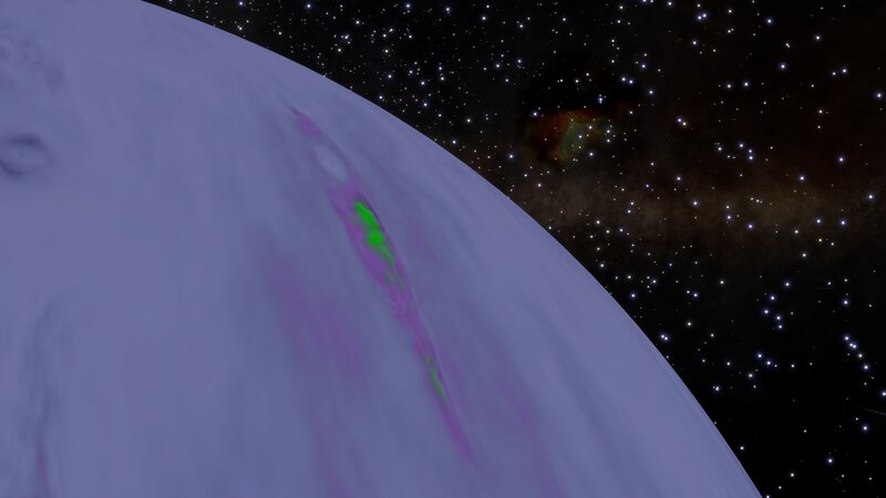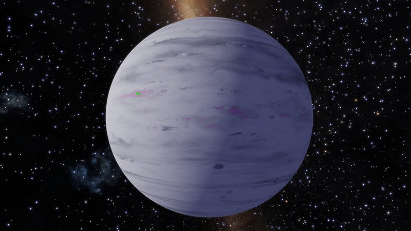 | A Class II Green Gas Giant with thin clouds of pink and green across equatorial regions. | → | A Class II Green Gas Giant with thin clouds of pink and green across equatorial regions. |
