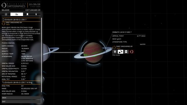 Description: Orbiting a neutron star in distant Ryker's Hope, this is the first known glowing green water giant, and a must-see for the long-distance explorer, being roughly on the route from Sagittarius A* to Beagle Point. The planet has a beautifully layered icy ring system. As this Green Water Giant is within Ryker's Hope, K10-Type Anomalies within its rings | |