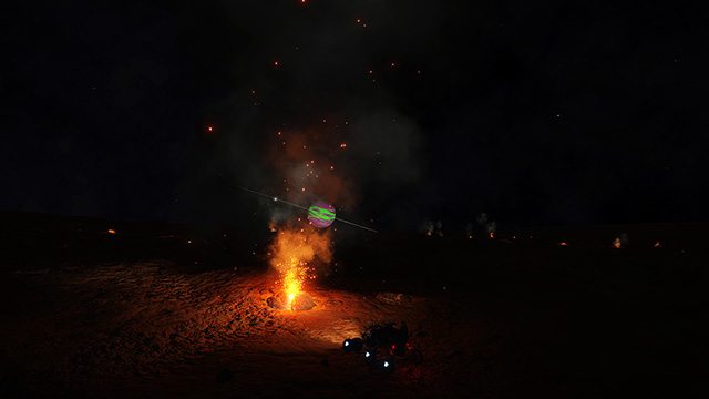 Description: A magnificent ringed glowing green gas giant with deep purple clouds in the Kepler's Crest region. Its bright colours shine on the dark velvet of space of this inter-arm region. Land near Silicate Vapour Geysers on planet 2 b a for an astounding and colorful view. This scenery is known for renewing the inspiration and dreams of any tired explorer.