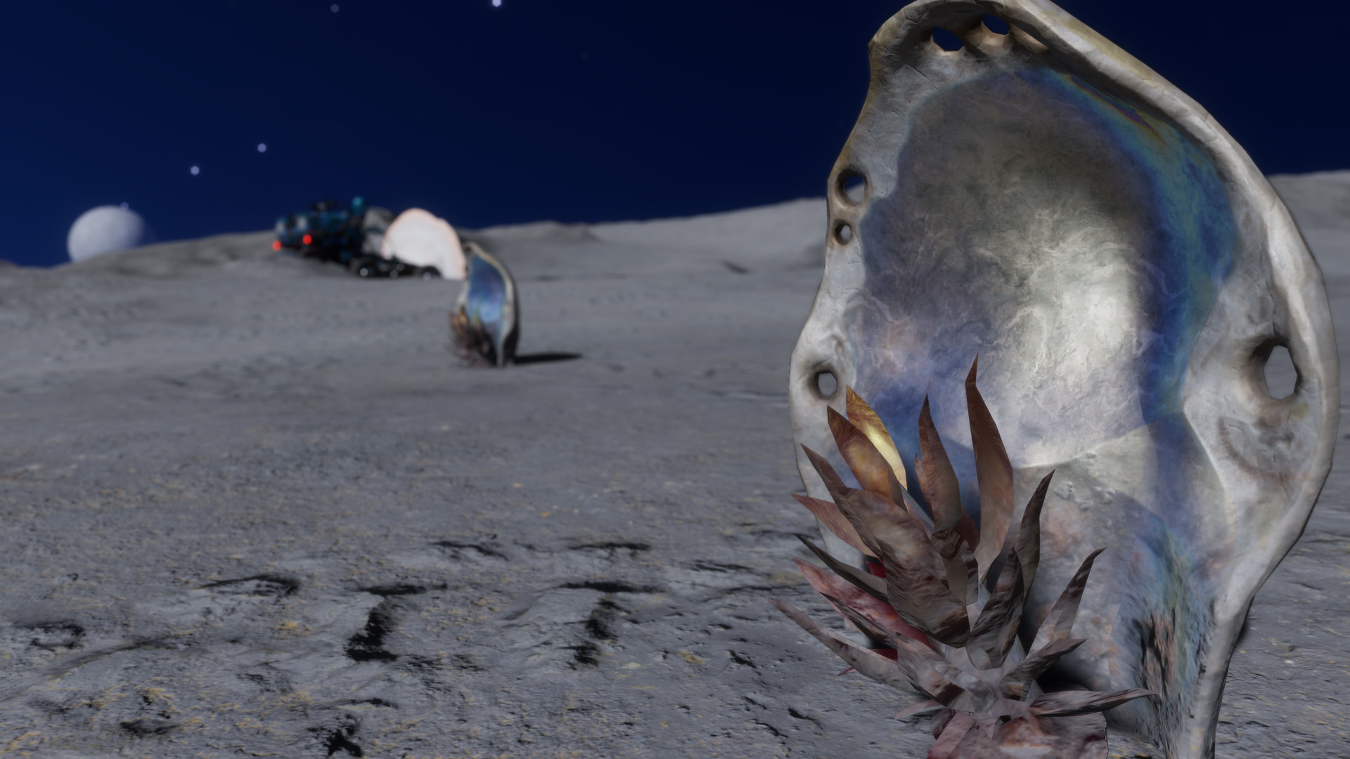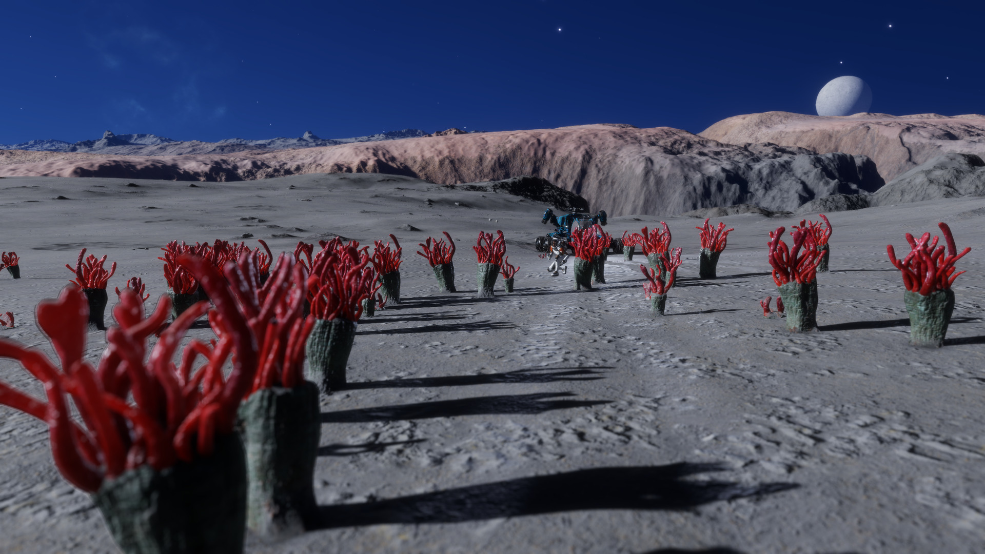Description: Planet 4 a has eight biological signals, with an atmosphere consisting primarily of water and a surface temperature of 423 K. The system primary is a neutron star, first discovered by CMDR Welvax. This planet is named Malcolm's World in honor of Dr. Ian Malcolm, who posited in the late 20th century that "Life, uh, finds a way." Clypeus Speculumi lifeforms on Hyuedau LV-Y d34 4 a: Fungoida Gelata - Mulberry lifeforms on Hyuedau LV-Y d34 4 a: A view of the landscape of Hyuedau LV-Y d34 4 a, with its "sun," a neutron star, just below the horizon: | |