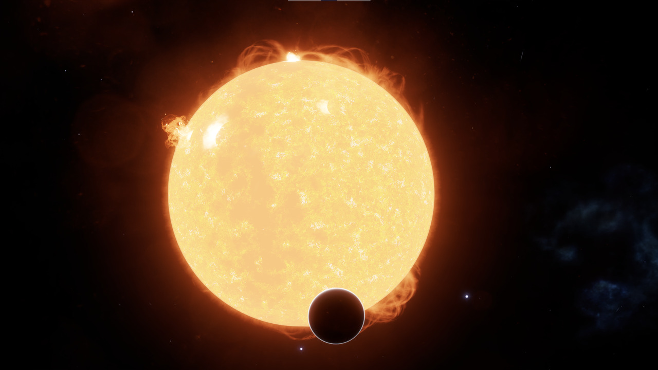 Description: There are three stars in this system and only one planet, a class V gas giant. Like many other such gas giants, it orbits its parent star close: its distance from the main star is only 5 ls (1,503,798 km from the center of the star). It is also quite hot, with a surface temperature of 2,217 K. | |
