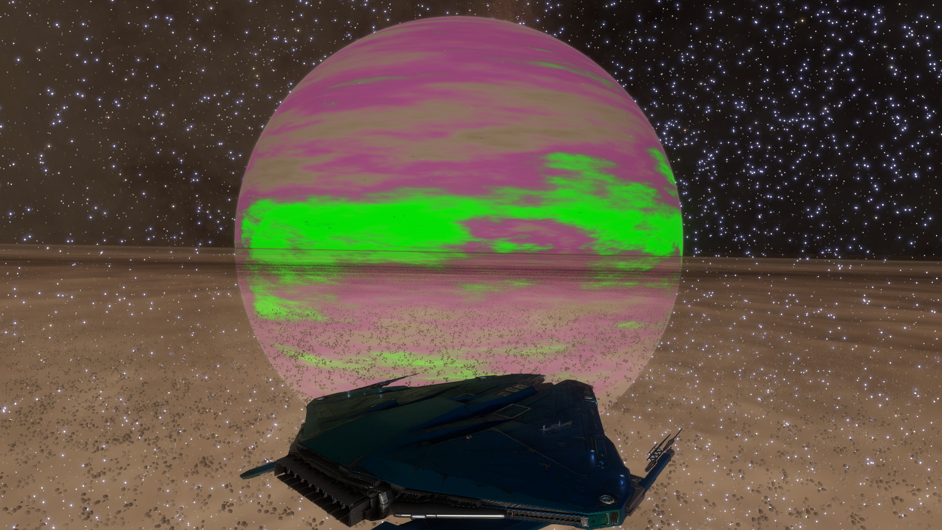 Description: Body A 4 in this system is a Class III Green Gas Giant within the Galactic Centre region. The planet is predominantly pink in color with a dark tan base cloud layer. Wrapping the gas giant about its equator, as well as in other regions as small patches, are brilliant bioluminescent green clouds. Since this system in the Galactic Centre region, K10-Type Anomalies can be found here in the three Notable Stellar Phenomena signals located within the planet's rings. The Green Gas Giant has four moons directly orbiting it, and body A 4 d has its own nested moon - making five moons total. Of the three that are landable, only A 4 a and A 4 d a are geologically active. A 4 a also orbits close to the planet's outer ring, and completes an orbit in under 20 hours. This discovery is also significant as this was the first time a second Green Gas Giant has been found within the same sector. The other Green Gas Giant, also Class III, is located just 895.55 ly away in the Byoomao JC-B d1-3681 system. Elsewhere in system are three atmospheric landable moons, A 6 a, A 6 b and A 6 c. All three have thin ammonia atmospheres and surface life signatures. | |