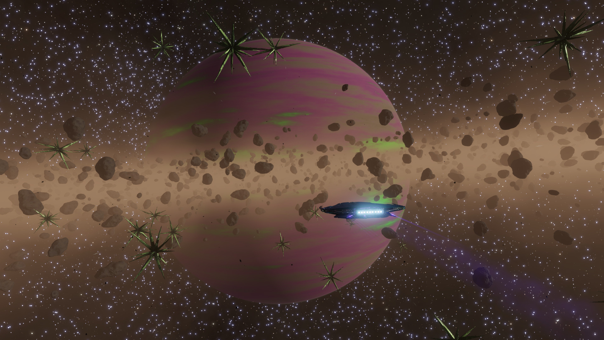 Summary: A green class III gas giant with a pink haze and vivid green equatorial clouds. There are K10-Type Anomalies within its rings. | |