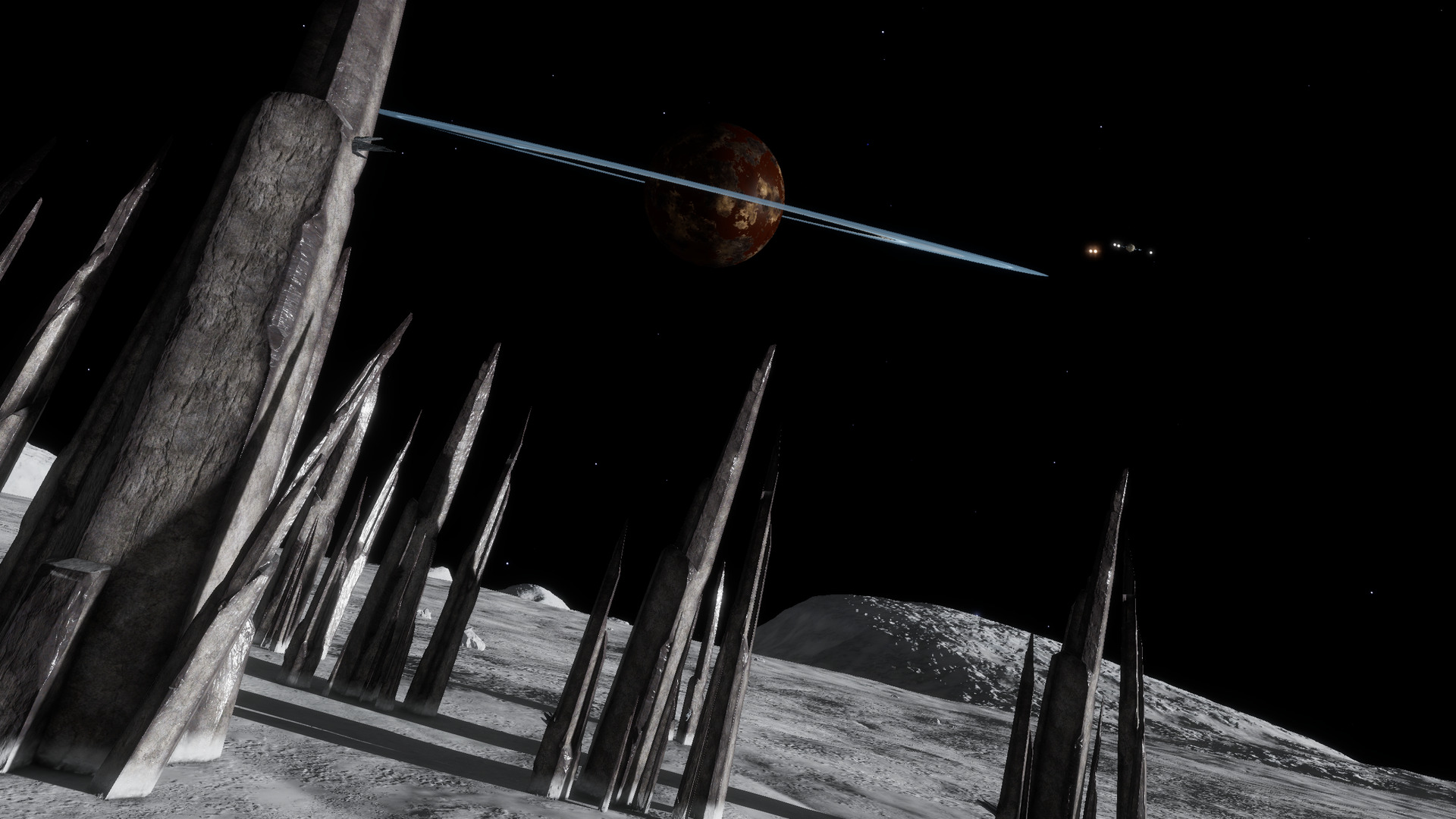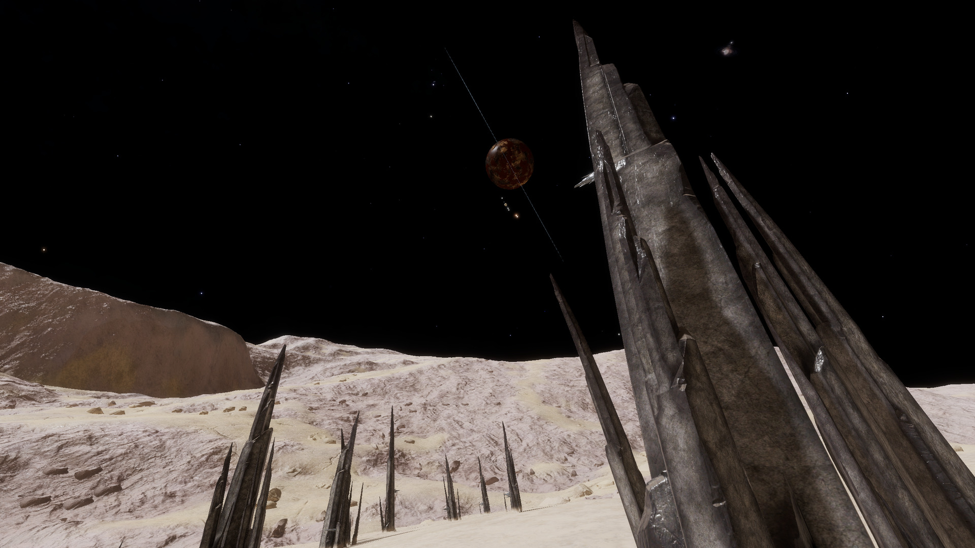 Description: Situated about 1,150 light-years East of the NGC 1491 Nebula, this system contains a ringed Ammonia World with two moons, both of which are home to Crystalline Shard fields. Carbon dioxide geysers dot the surface of B 7 a, while B 7 b features ammonia-based volcanism. The crystalline shards on both moons yield ruthenium. The shards on B 7 a seem to populate the flat portions of the moon's surface, while they're more populous in the highlands of B 7 b. In addition to the exobiology payout from sampling the crystalline shards, their ruthenium deposits can be used for premium Automated Field Maintenance Unit module reload synthesis. The name of this point of interest is inspired by dragon's teeth fortifications, first used to impede tanks and infantry vehicles in World War II. Clusters of crystalline shards have been known to similarly impede surface reconnaissance vehicles. | |