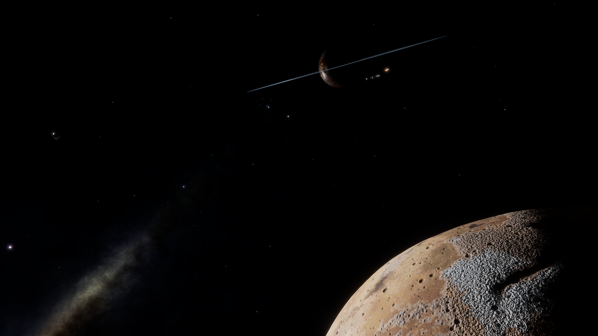 Summary: Two moons with crystalline shards orbit a ringed Ammonia World in this system. | |