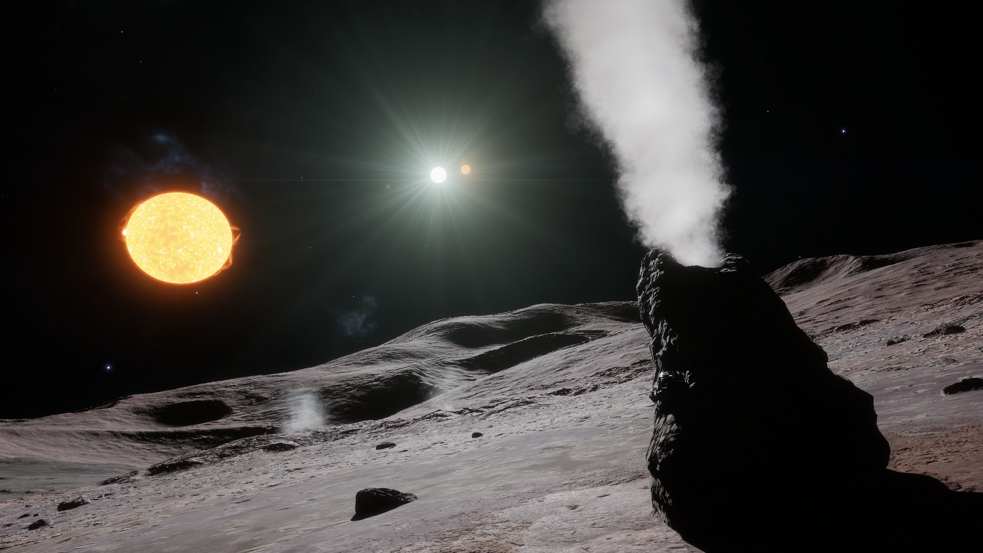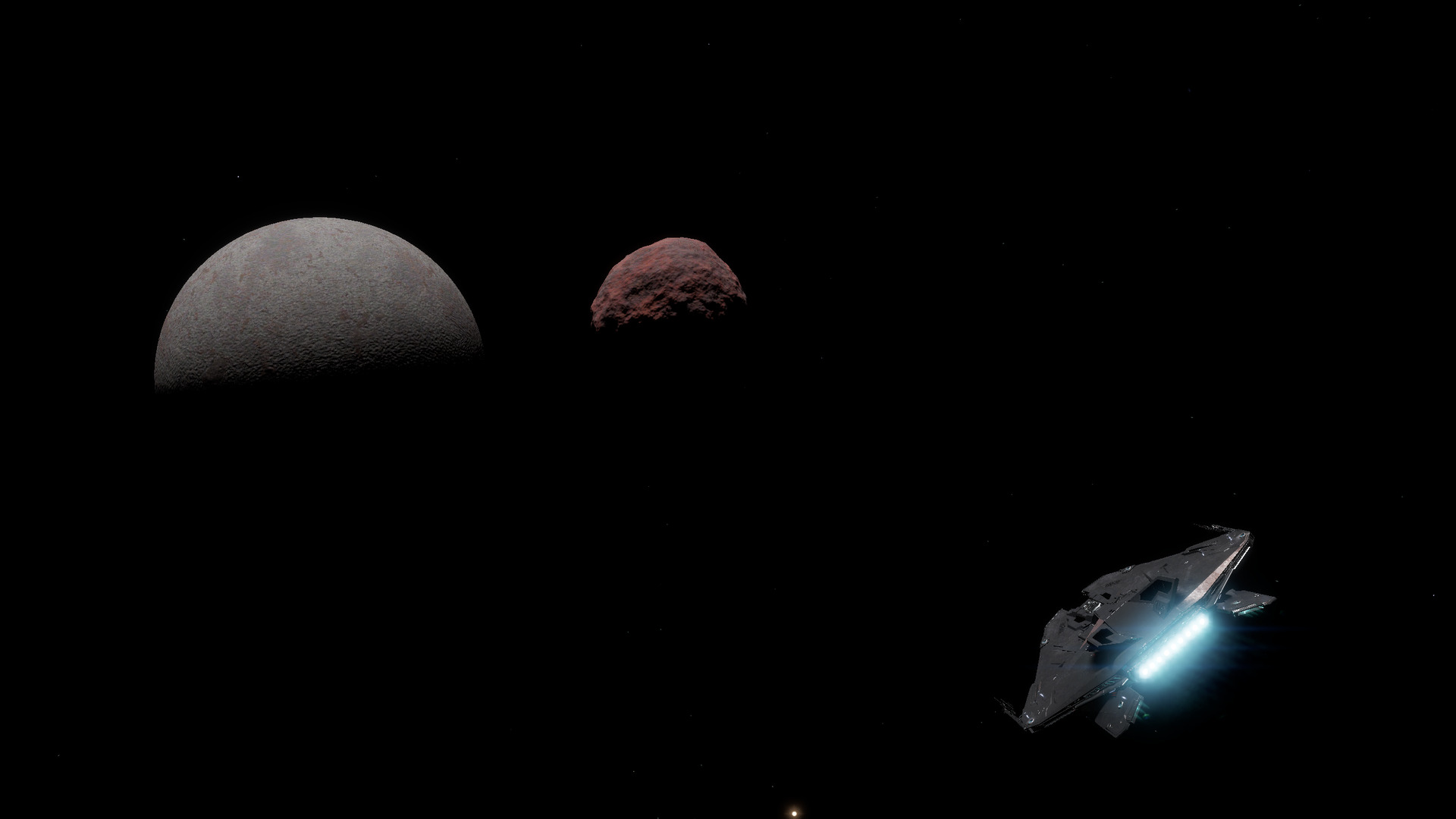 Description: This system has a number of remarkable features, including a Sudarsky Class V gas giant that orbits its binary parent stars at a distance of about 12 light-seconds. But the most interesting feature of this system is body C 1 a, a moon with a radius of just 154 km. By comparison, the smallest discovered moons in the galaxy, have radii that are only 15 km smaller. (The record holder as of 3309/02/17 is Pria Thoi ZP-G d10-37 AB 4 a, with a radius of 137.38 km.) The primary stars in this system are a class A and a class K star, with a Sudarsky Class V gas giant orbiting them just 12 light-seconds from their common barycenter. The third star has only one planet and one moon, which's irregular shape and iron-nickel composition make it look like a meatball. The body is four times smaller than its parent planet, and 70 times less massive, with a surface gravity only 0.04 g. There is active volcanism on the moon: tidal forces from the C star and the parent planet heat its interior, producing silicate fumaroles and gas vents across the moon's surface. | |