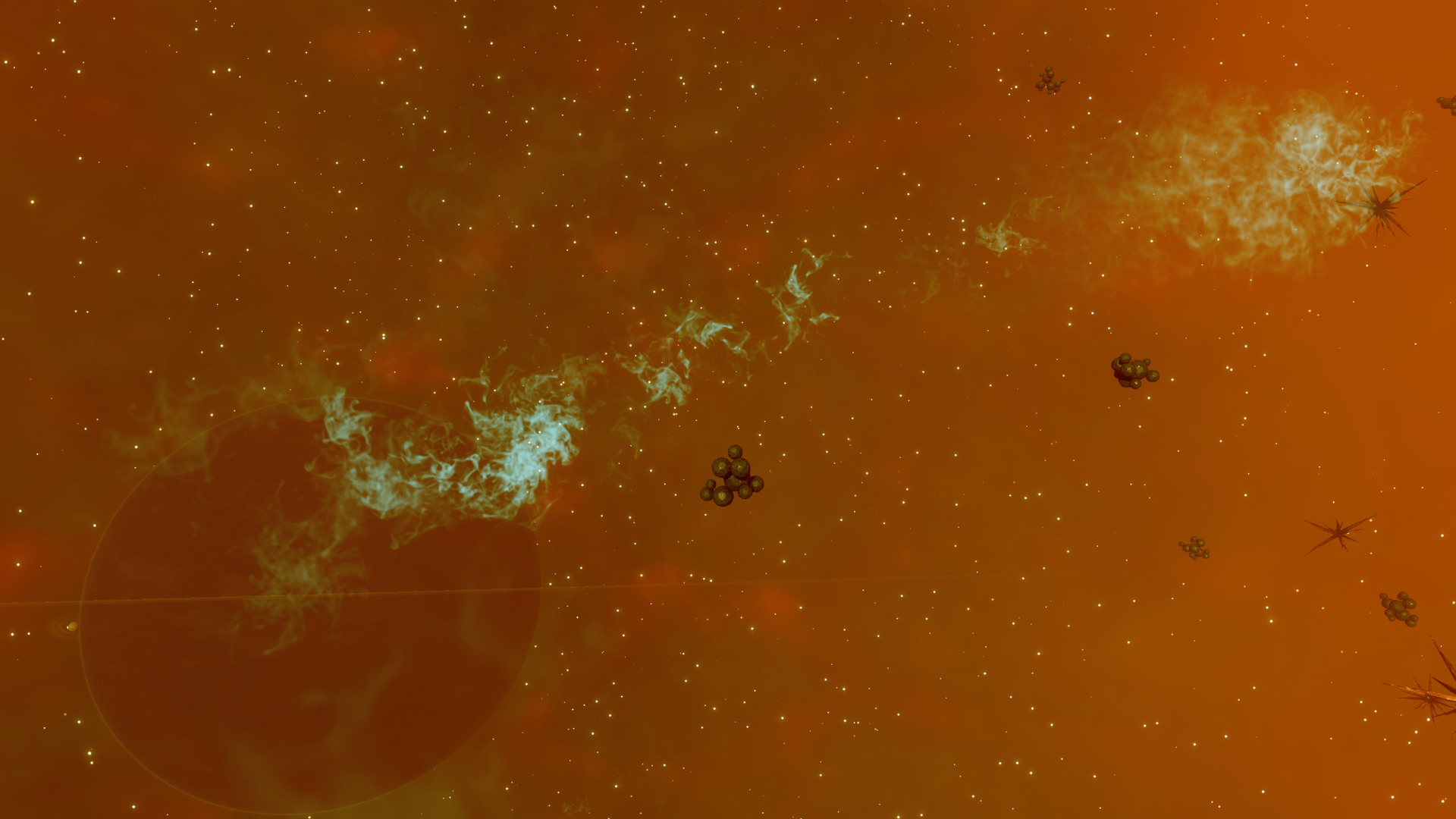 Description: Phleedgaa UJ-Q e5-185, nicknamed the Susano'o nebula after the Shinto god of storms and seas, is at first glance just one of the many planetary nebulae in the Izanami region. What makes it stand out from the rest are the stormy Lagrange clouds that can be found within the system, and the wisp-like E03-type Anomalies that dwell within them. (Which can also be found in systems that meet the spawn criteria up to 100 ly away from the nebula.) These Anomalies are small, and as their blue light is rather faint, most of the time they can only be seen clearly against a darker background. They tend to wander around, and are often noticed only by the trail they leave behind as they weave through the clouds. Commanders can approach these lights safely: the only effect they have on ships is that they scramble the ship's displays at close proximity, but they cause no lasting harm otherwise. The wisps also emit vaguely unsettling noises: however, if they are encountered within the storm clouds, this can be difficult to hear over the thunder. According to the Codex, these Anomalies will follow for a short time any ship that approaches them. Recent observations have shown however that they seem to "lose interest" almost immediately. Some Commanders have claimed that the wisps attract thunder strikes, but this is surely just superstition. However, flying into the electrically active regions and getting hit by the lightning can be dangerous. Most ships should be able to withstand them long enough to leave the electrically active parts of the clouds, but it's best not to linger. The stormy cloud around the first planet (Phleedgaa UJ-Q e5-185 1) is the one that's the most visually striking, as its centre is entirely dark. The only light that can be seen within it is the system's neutron star, and the occasional Anomalies flying around. Around other Lagrange clouds, such as the one in orbit of the third planet, the Anomalies might not appear blue, as the cloud tints their colour: Other E03-type Anomalies can be found at Lagrange points around neutron stars within 100 ly of the planetary nebula, which is an oddly large radius: for most other Anomalies, it's 10 ly instead. However, as of 3309 March, storm clouds have only been found inside the nebula proper. | |