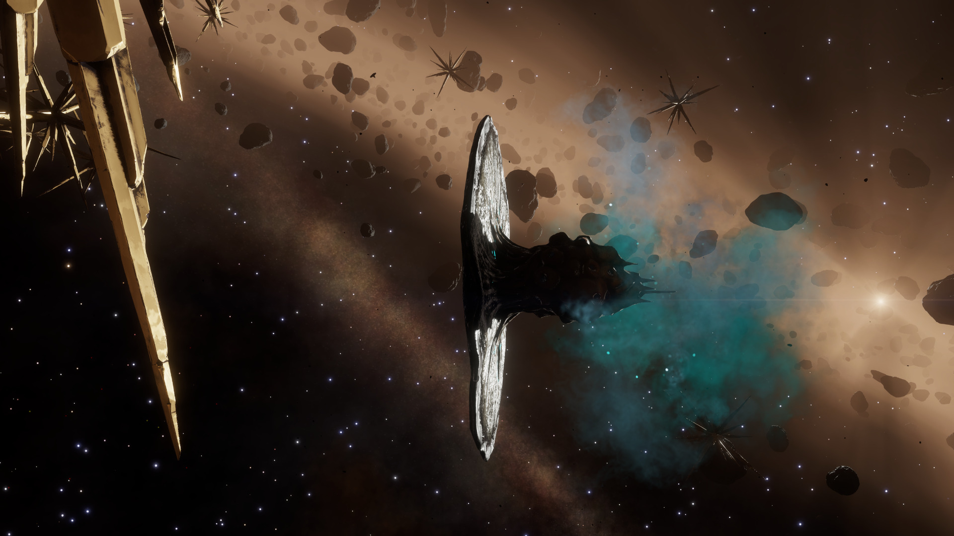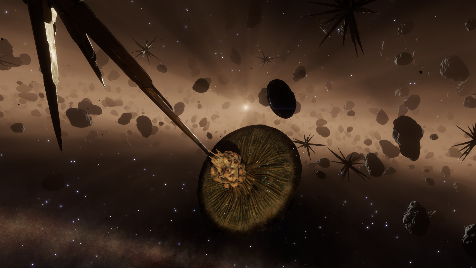 These large molluscs can be found floating around in asteroid rings, belts, or gas clouds that have accumulated around Lagrange points. They are quite docile, and pose no threat to explorers.