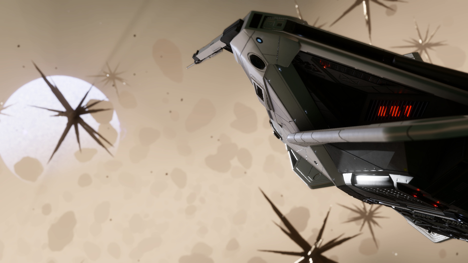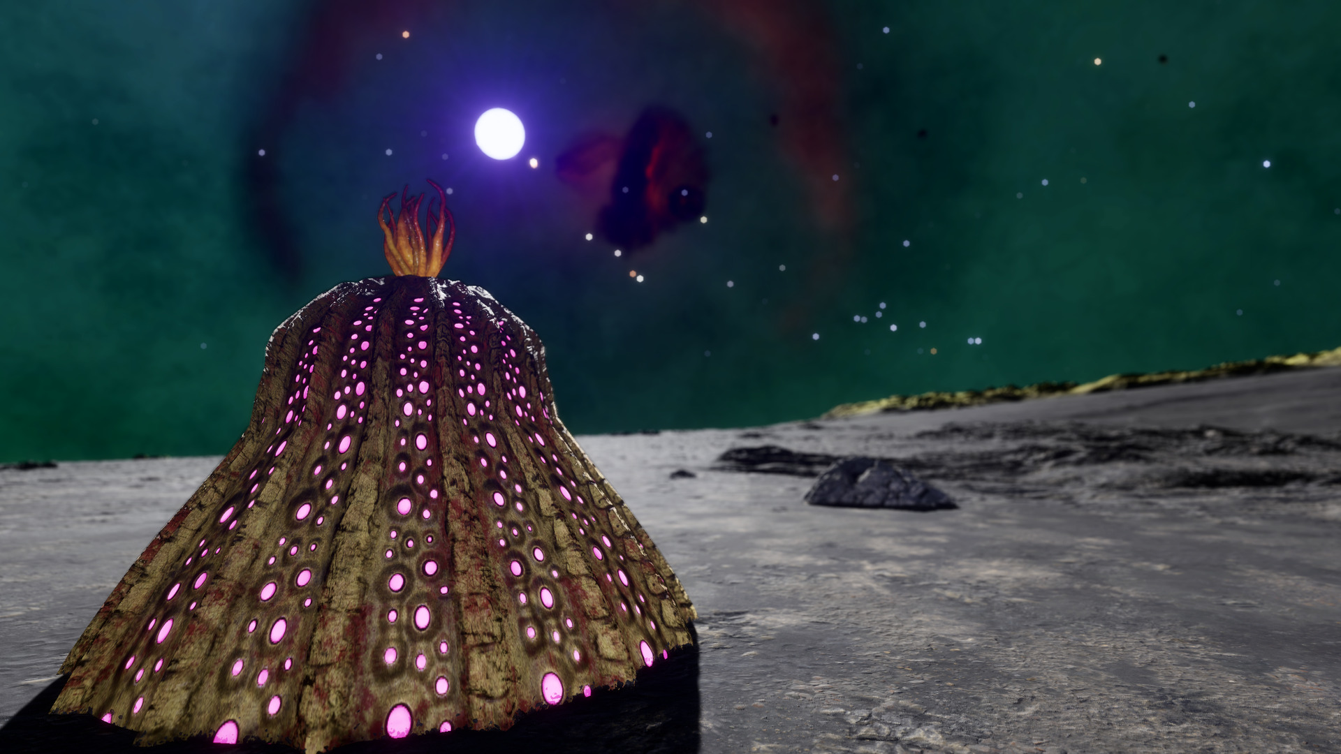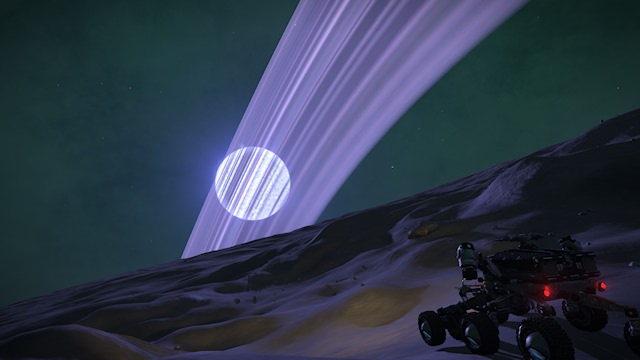 Description: The Spirograph Nebula (IC 418) at BD-12 1172 is a planetary nebula 1,100 light-years from Sol in the direction of Barnard's Loop and the Orion Nebula. Only a few million years ago, the central star BD-12 1172 (also known as HD 35914) was probably a common red giant star. After running out of hydrogen, the outer envelope has expanded rapidly, leaving behind a hot remnant core destined to become a white dwarf. The nebula has strong green colors, which combine with the blue-white of the O-class primary star to create stunning visuals on several rocky planets. Navigating to the Spirograph Nebula (seen above from Spirograph Sector PD-S b4-0, 6.31 light-years away) can be complicated due to the permit-locked Col 70 Sector. An easy way to route around Col 70 is to plot a course for Shenve in the Witch Head Nebula, and from there plot again to BD-12 1172. Both the second and the tenth planets hold Notable Stellar Phenomena (NSPs) in their rings. The former's metal-rich rings contain a high level of dust particles, allowing the crystalline structures inside to create crepuscular rays when silhouetted against the primary star. Viride Gourd Molluscs form the NSPs, though their small size requires pilots to track down their flickering radar tracks. The molluscs react to ship headlights, sometimes engaging in behavior that resembles a game of tag. Explorers can also find Lattice Mineral Spheres at the NSPs in the tenth planet's rings, along with Rubeum Metallic Crystals. Prasinum Bioluminescent Anemones can be found on the surfaces of several bodies in the system, including planet 2 and the 10 a moon. Pilots attempting to land on the second planet should be advised to fly cautiously, as the planet's gravity is 1.75 g. However, those who do make the landing safely will be treated to spectacular views of the ring against the blue-green sky inside the Spirograph nebula. | |
