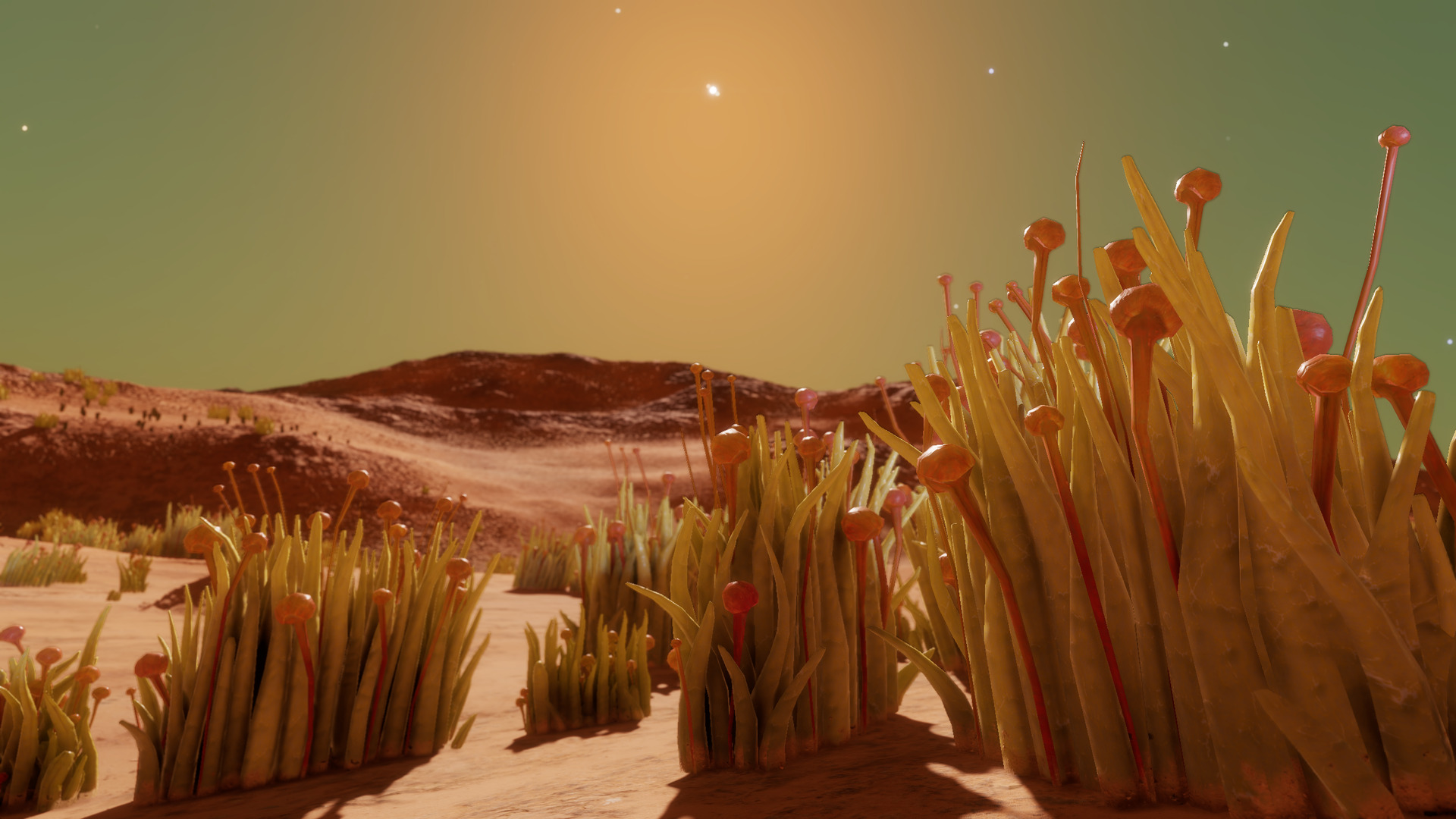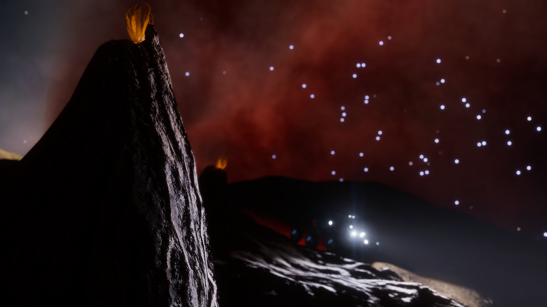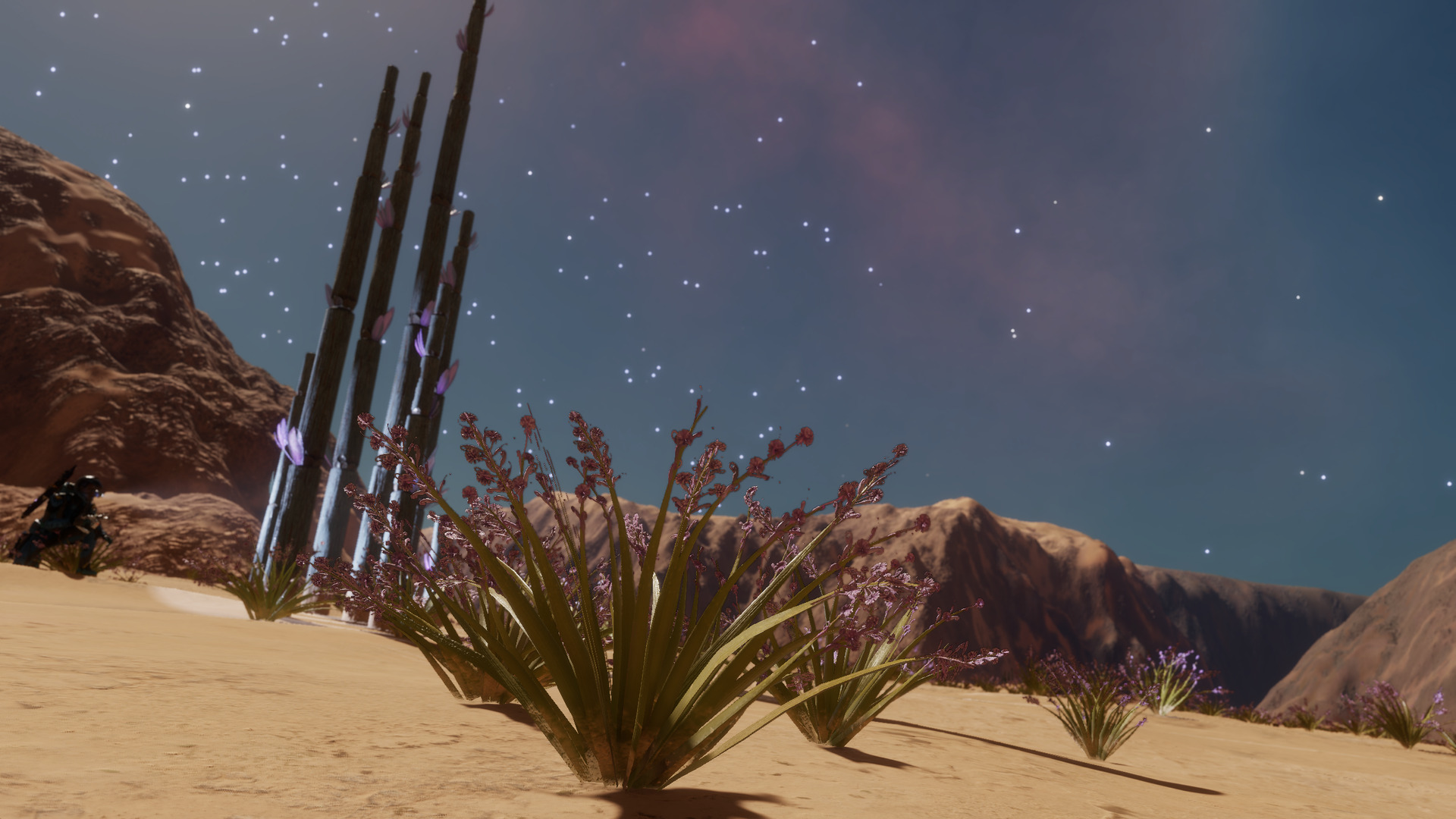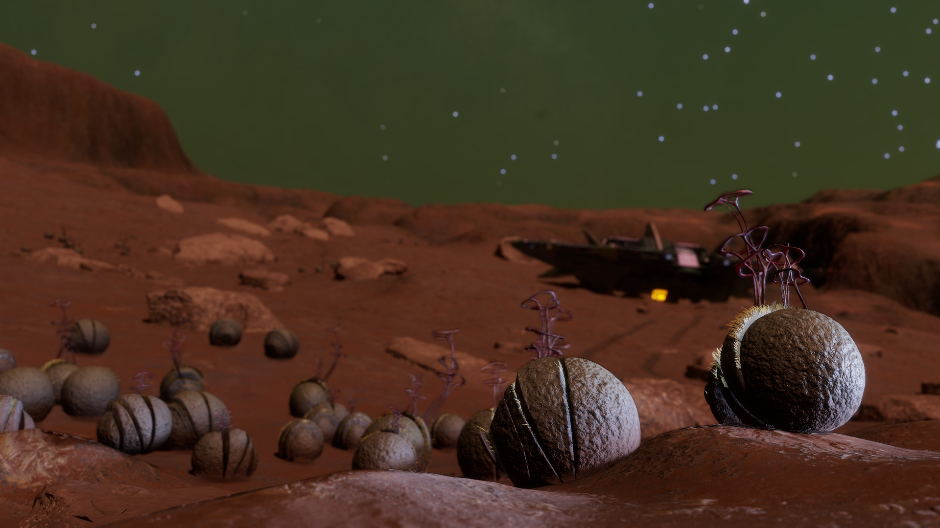 Description: This system, located near the Crookaae AA-A h129 Nebula, nicknamed the Dragon's Tail Nebula, is home to more than a dozen species of exobiological flora. Body 4 a is the closest moon to the central star with exobiology, in the form of Bark Mounds. These large fungal cones grow up to 4 meters in height and can often be found with mineral deposits growing near their tops. Body 8 f is a rocky moon with a thin ammonia atmosphere that's home to 10 families of alien plants, ranging in size from Bacterium Alcyoneum colonies to Tubus Rosarium. Close examination of the Tubus shows indigo-colored fruit toward the top of its stalks. Osseus Spiralis are somewhat more rare, growing along the rocky outcrops above the otherwise sandy terrain of the moon. The sands are home to most of the other vegetation that grows here, including Stratum Paleas, Fungoida Setisis, Cactoida Peperatis, Tussock Catena, and Frutexa Flammasis. The Concha Aureolas prefer more solid ground, growing where their roots can establish themselves in the soil. Finally, Body 10 e contains four distinct species of plants, including Tussock Propagito, Tubus Cavas, Stratum Limaxus and Bacterium Aurasus. | |