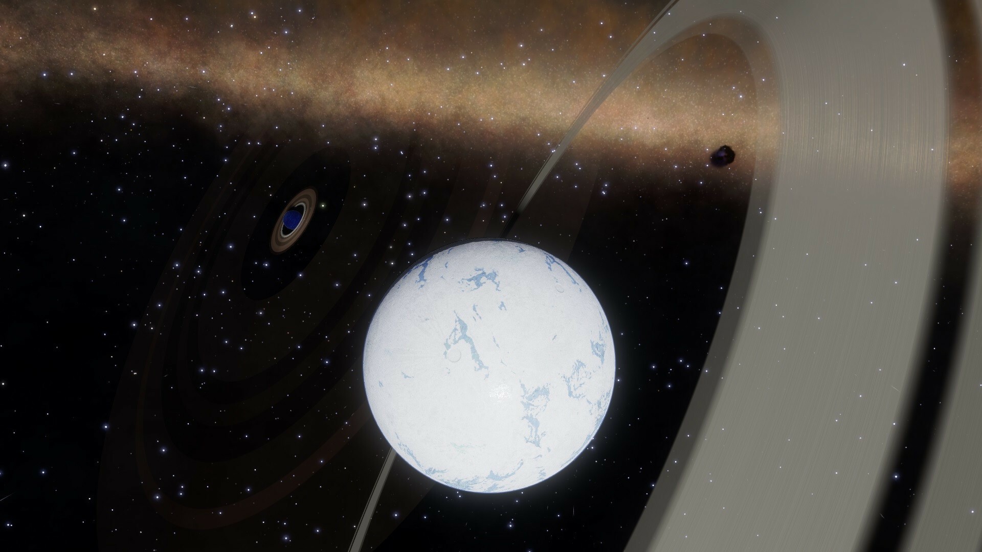 Summary: A ringed moon of a gas giant with a highly inclined and close orbit. | |