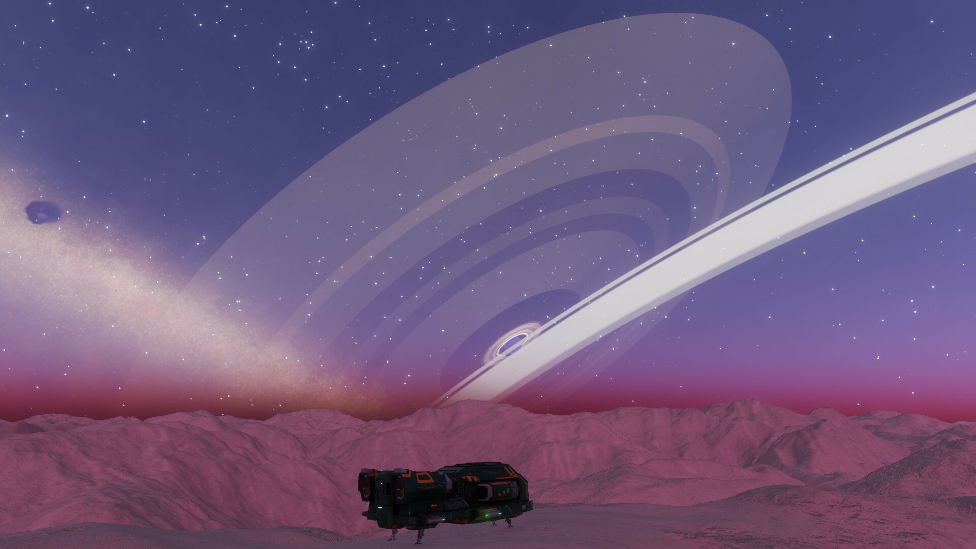 Description: Body A 6 b is a ringed icy moon orbiting a Class III Gas Giant that has a wide outer ring. They cover much of the moon's sky, due to the inclined orbit. The thin oxygen atmosphere gives the rings a purplish, somewhat magical hue reminscent of Tyrian Purple, a famed natural dye that has been made on Earth for more than 4,000 years. Walking on purple ice with the gas giant's rings prominently in the background: Another view from the surface: View from orbit: | |