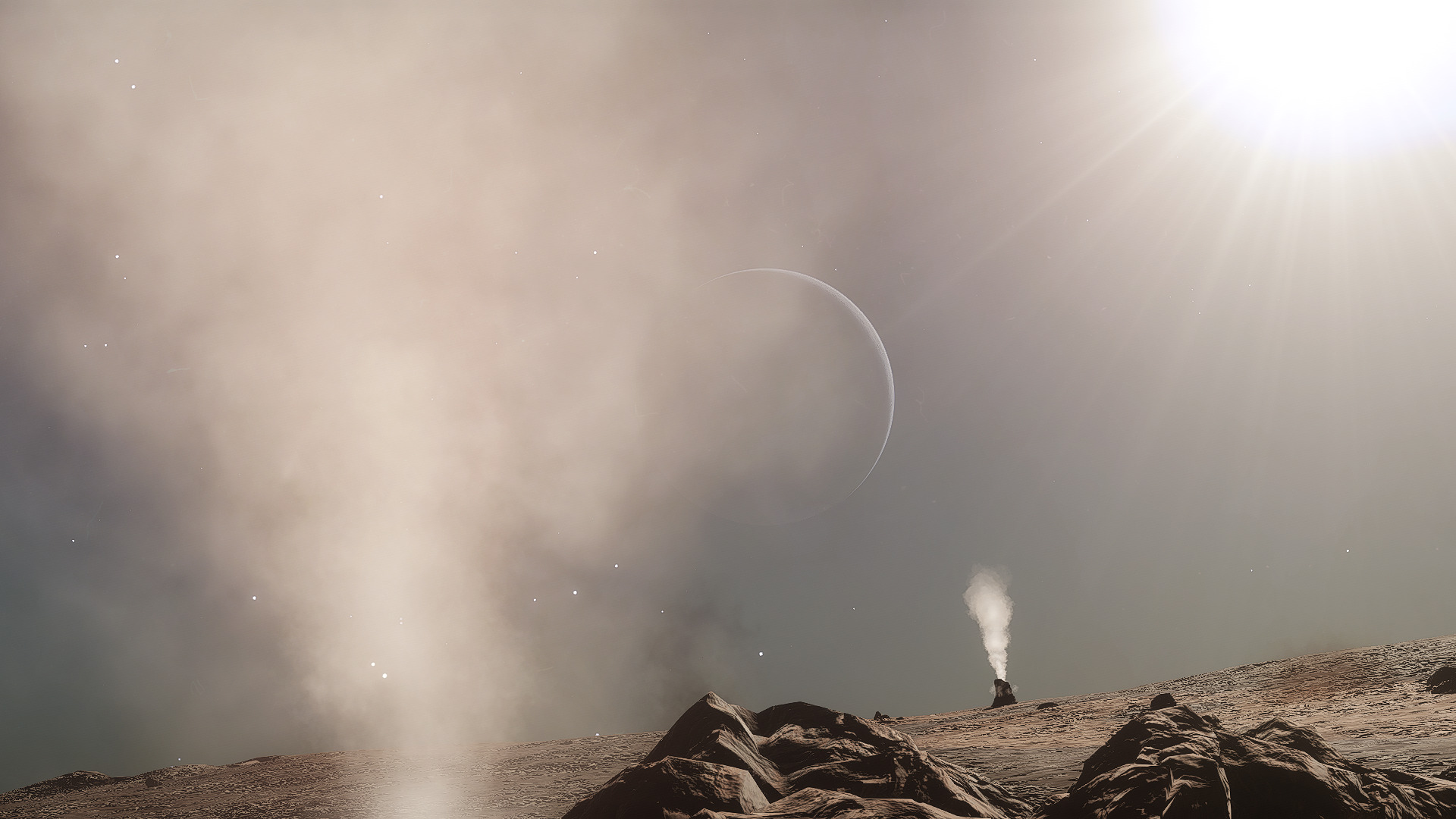 Description: TriVista Celestia in the Temple region has three planets not far from the arrival point (4,400 light seconds) providing nice surface sights. Two of the thin atmospheric planets are geoactive and have surface life, in the form of bacteria. The orbital periods of C 3 and C 4 are only 0.3 days, which means the planets do a full orbit around their barycenter in just 7 hours. View of C 4 from C 3 | |