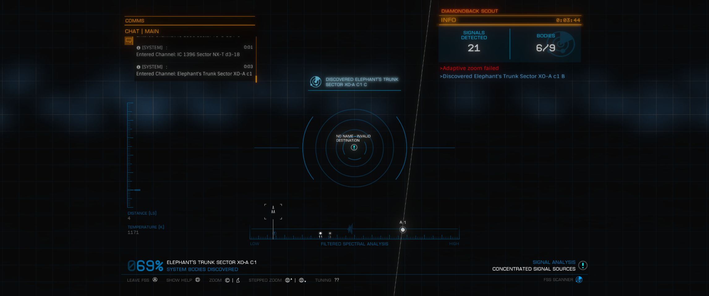 Description: This system houses Tourist Beacon 0029, which appears to have been malfunctioning for many years now. The name (or identifier) that the beacon broadcasts is "NO NAME - INVALID DESTINATION". For example, here is what greets explorers if they use the FSS: The beacon is in low orbit above the A 1 planet, and can be approached normally. It sends the following message after scanning: