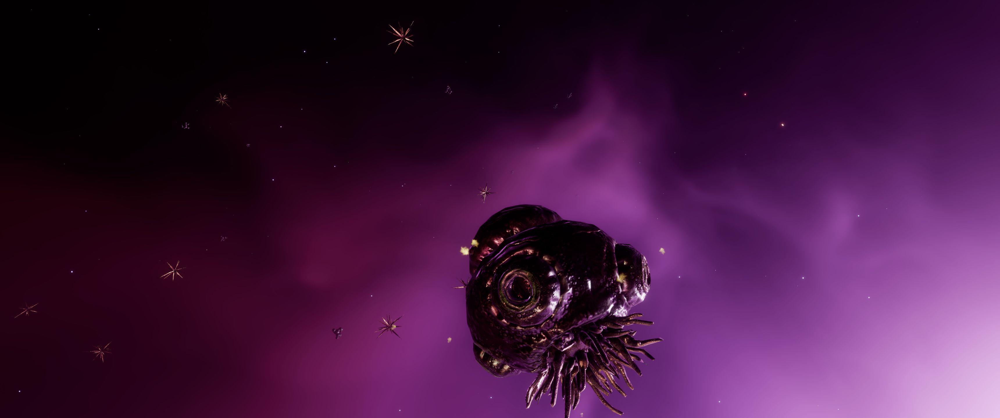 Description: The Traikeou AA-A h2 nebula is the Westernmost nebula in the Inner Orion Spur region, situated roughly 8,500 ly from Sol. The cloud itself is rather large, and its area has a decent star density: as such, it's easy to travel here, and there are plenty of photo opportunities. However, the main reason to visit this nebula are the tiny Purpureum Gourd Molluscs that are native here, and cannot be found elsewhere in the galaxy. Like the other Gourd Molluscs, these are quite small, and as such, easy to miss - especially among the much larger crystals and mineral spheres. At first, only uncertain signals will show up on the scanner, and Commanders have to fly quite close (within around 800 - 1,000 m) to have their ship resolve the signals and identify the molluscs. Although these molluscs seem to emit a caustic-looking trail as they fly around, these unknown chemicals are harmless. They do not react violently to approaching spaceships either: rather, these molluscs exhibit a behaviour that's often seen as playful. When a ship approaches them, they fly towards it as well, only stopping at a close distance, then turning around and flying back... only to come to a stop, then turn around and fly to the ship once again. These Purpureum Gourd Molluscs can be found in the following systems: As the system is in the Inner Orion Spur, the Albulum Gourd Molluscs that can be found anywhere in the region appear here as well. The nearest system that's known to house them is Traikeou KO-E c13-2. In addition to these, there are also Bark Mounds to be found on the surfaces of suitable planets (and moons) near the nebula, within 200 ly of its center. For explorers who journeyed here from the bubble, the Prai Hypoo AA-A h60 nebula has been a popular destination to go to next, as it hosts other Notable Stellar Phenomena, and Guardian Ruins. | |