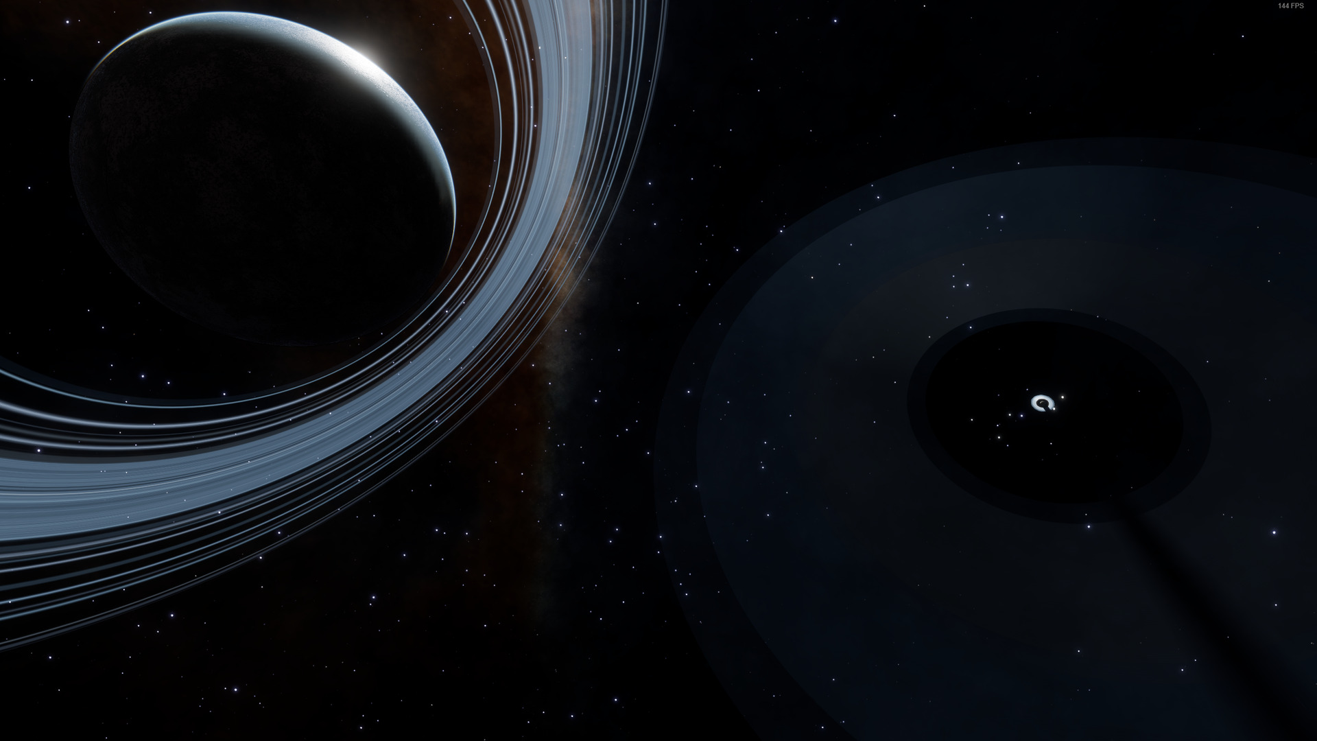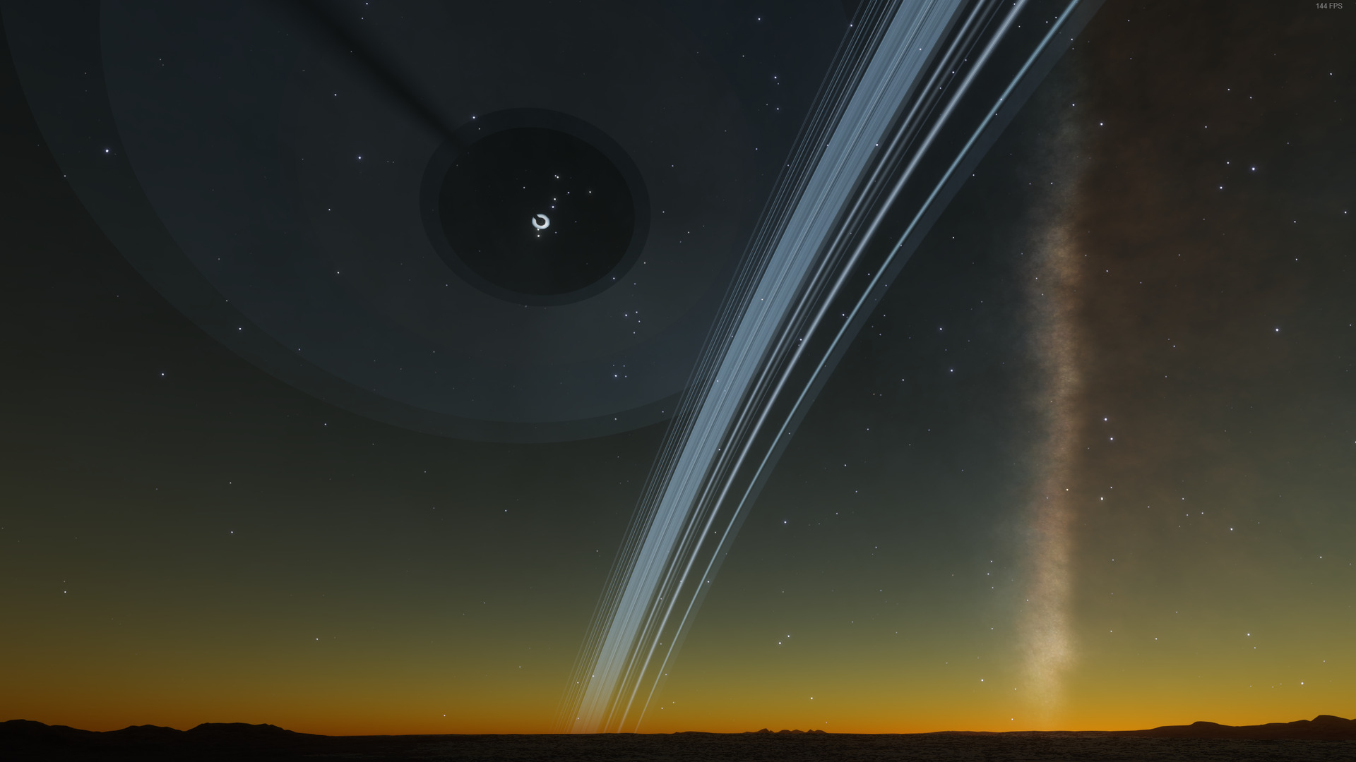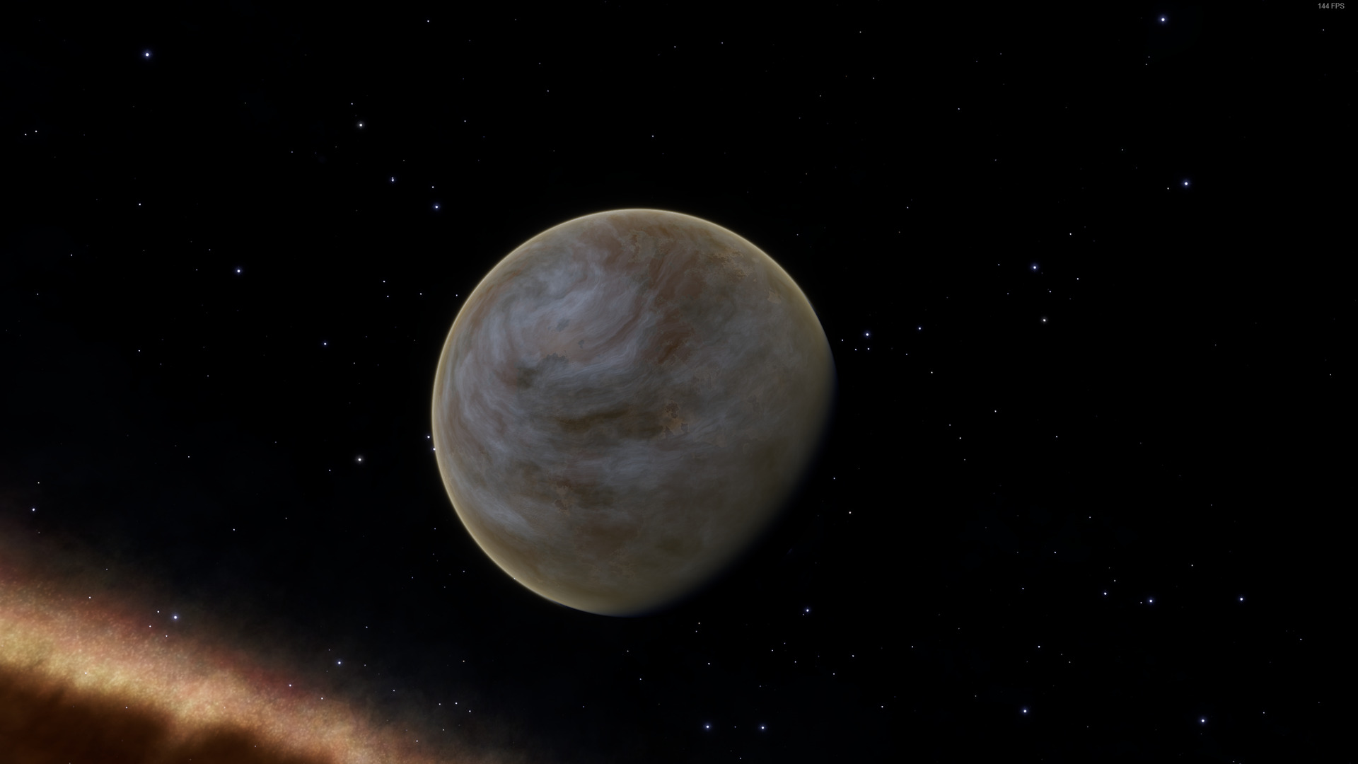 Description: The fourth planet in this system is a Class I Gas Giant with an exceptionally wide outermost ring, coming in at 4.4 million kilometers in radius. The system's main attraction is the gas giant's seventh moon (4 g). It is a ringed icy moon with a thin nitrogen atmosphere, with a high inclined (67 degrees) and close (0.05 AU) orbit around its gas giant. Thanks to these, the resulting views are stunning. From the surface of the planet, the giant's outer ring can be seen faintly through the planet's atmosphere during the day. However, during the night it is starkly visible, and along the moon's terminator it remains visible through the twilight. In addition to this moon, the giant also hosts a total of six shepherd moons between its second and third rings, with two pairs of moons in close and fast binary orbits. Powerful geysers can be found on the surfaces of the 4 b and 4 d moons. The system also hosts a large Ammonia World with wispy clouds. | |