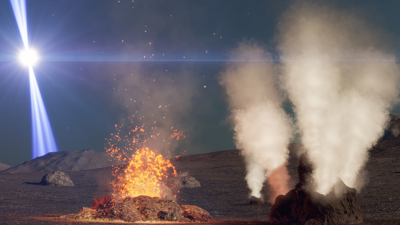 There is active volcanism on the planet, with silicate vapour geysers. Temperatures on the planet's surface fluctuate between 297 K and 581 K, allowing for safe landing and disembarkation at any time.