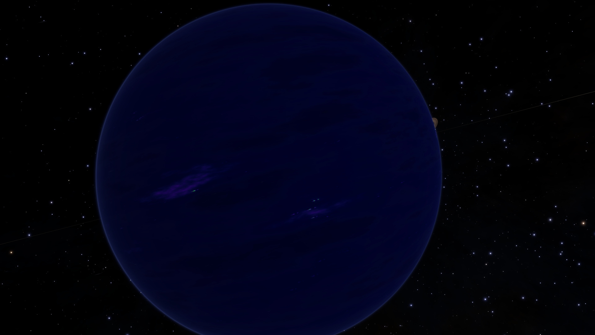 Description: Planet 1 is a blue Class III Gas Giant with small spots of green around its equator, so tiny that they resemble fireflies. There are areas of lighter blue and deep magenta around and near the clouds.