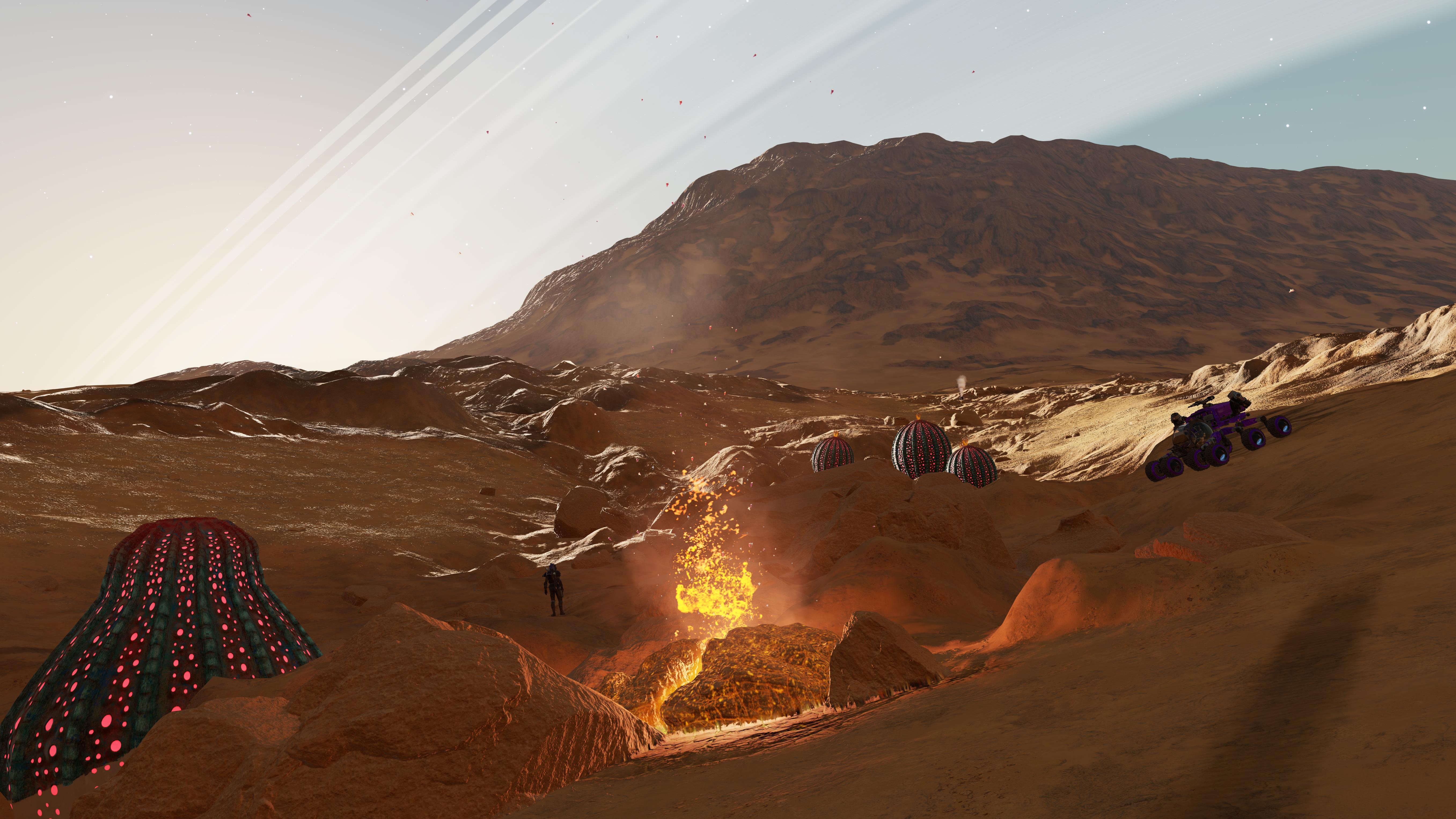 Description: Four bodies in this system are host to two species of extremophile life: Luteolum Anemones, which are found occasionally on hot metallic worlds, and Sinuous Tubers, found on volcanic worlds within specific zones in the galaxy. The anemones inhabit planets 1, 4, and 8, while the Sinuous Tubers are present only on one body, the nested moon 6 a a. The 6 a a nested moon sprouts Sinuous Tubers. It consists of a very close binary of the larger 6 a moon and the smaller 6 a a nested moon, with a orbital period of five hours. The latter has surface volcanism, major silicate vapor geyser activity, caused by the strong gravitational forces. Body 8 is a visually striking thin carbon dioxide atmosphere terraformable ringed High Metal Content world, with metallic magma volcanism under a comfortable 253 K and a heavier gravity of 1.4 g. This body is notable for being an example of airless organics thriving on a thin atmospheric world, which is a rare phenomenon. | |