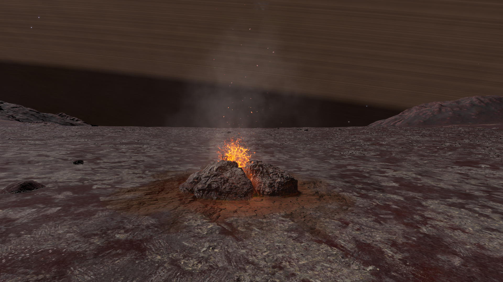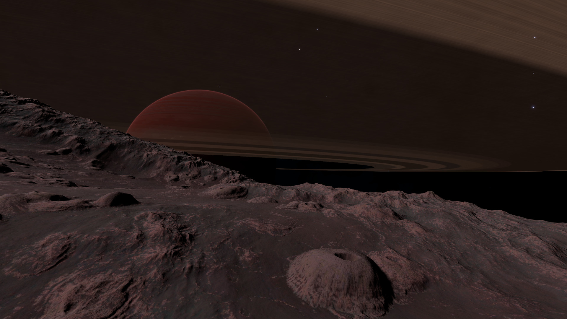 Description: The second body in this system is a Class IV gas giant, and its first moon (2 a) orbits it with an inclination of 2.21°. Although this inclination is small, it's still enough for the giant's rings to appear above the moon's sky - and at this distance (372 km to the rings' edge), they can cover large parts of the sky. The moon features surface volcanism: Metallic Magma, as well as three geological signals: Sulphur Dioxide Fumarole, Iron Magma Lava Spout, and Sulphur Dioxide Gas Vent. There are also three other bodies in this system with large rings: two class Y dwarfs and one class IV gas giant. However, aside from their rings, there is nothing of interest on them. The name is inspired by the myth of Helios crossing the skies every day. It emphasizes the movement of the ring system across the moon's horizon. | |