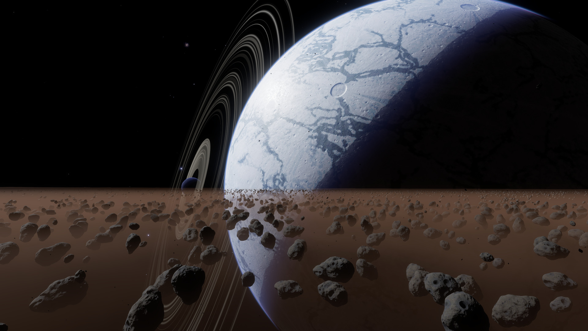 Summary: A ringed moon with an oxygen atmosphere, orbiting a ringed blue gas giant on a high inclination and at a close distance. | |