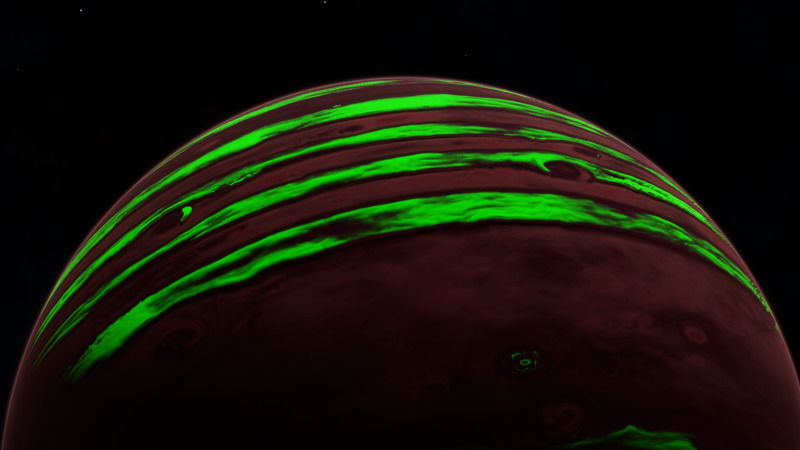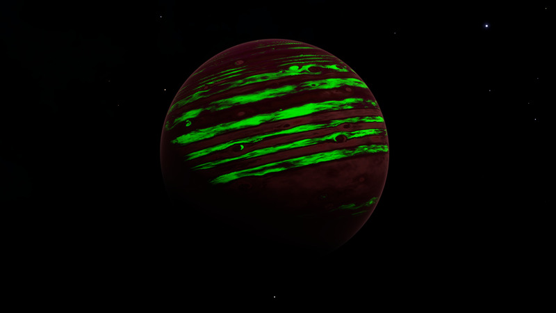 Summary: A Class IV Green Gas Giant with vivid bands of green clouds, the first one to be discovered in a proto-star system. Also the youngest, only 2 million years old. | |