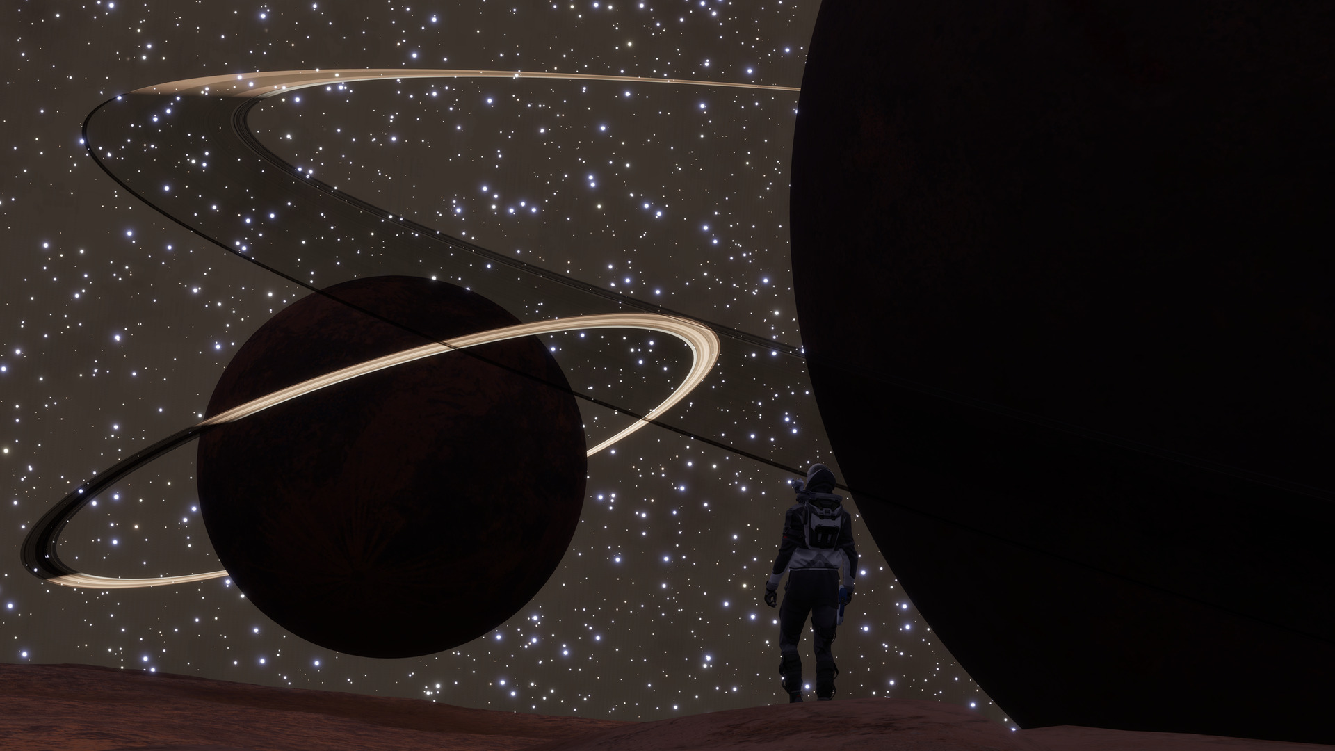 Description: In ancient Greek mythology, Ares and Athena were both gods of war, but they represented opposite aspects of warfare. Athena embodied wisdom, and utilizing cunning strategies in battle, whereas Ares embodied fury, the chaos and violence on the battlefields. Zeus, the head of the gods, stood above them both, always ensuring that none of the two gained lasting victory over the other. As an allegory to this tale, here in this system two ringed worlds are locked in eternal balance, overseen by a silent moon circling the pair. These two planets are closely-orbiting metal-rich worlds, each surrounded by narrow rings, and a small rocky moon that passes near one of the rings at a slight inclination. Between the three, Commanders visiting this system will find fast-moving ring structures, hazardous approach zones, and stunning views of all three bodies from the moon's vantage point. Ares (the first planet) and Athena (the second planet) circle one another in a tight 0.4-day binary orbit, both showing surface volcanic activity and blistering heat, with temperatures ranging from 705 to over 1,370 K. Each is encircled by two sharply defined rings: Ares' metallic inner band gleams between 13,389 and 14,014 km, while its rocky outer ring extends to 15,048 km. Athena's rings are more compact, they form a metal-rich belt from 10,864 to 10,989 km, and a rocky belt stretching to 11,852 km. Zeus (1 a) is a small rocky moon, just 441 km in radius, orbiting Ares every 0.2 days, with a slight inclination of 5.32°. From the moon's surface, Ares dominates the sky with Athena looming just beyond it, and both planets are framed by their shimmering rings. Further from the binary lies Poseidon, the fourth planet: a vast gas giant whose bulk dwarfs the inner worlds. According to legend, the gods were in a conflict over a precious city, and the two strongest contenders ended up being Poseidon and Athena. To resolve the conflict, Zeus decreed that the two should offer gifts to the inhabitants of the city, and the god who found more favor with the mortals would be their new patron. Poseidon brought forth a spring from the ground, but because he was the god of the seas, the spring's waters were salty. Seeing this, Athena planted olive trees over the spring instead: the people saw this as a more wise gift, as the trees and the fruits they bore were much more useful to them. The contest was thus decided, and the inhabitants then named the city as Athens. The gas giant's swirling bands evoke this rivalry, looming beyond the dueling pair. Orbiting close to Poseidon is Triton (4 a), highly inclined at nearly 90 degrees, a faithful moon named after the sea god's son and herald, forever bound to his father's side. The scenes in this system evoke a sense of suspended judgment from afar. Fury and precision locked in perfect opposition, and a silent overseer forever circling above. Here, their quarrel plays out under the distant gaze of Poseidon, whose presence reminds visitors that rivalries in myth, and in the stars, are rarely confined to only two parties. | |