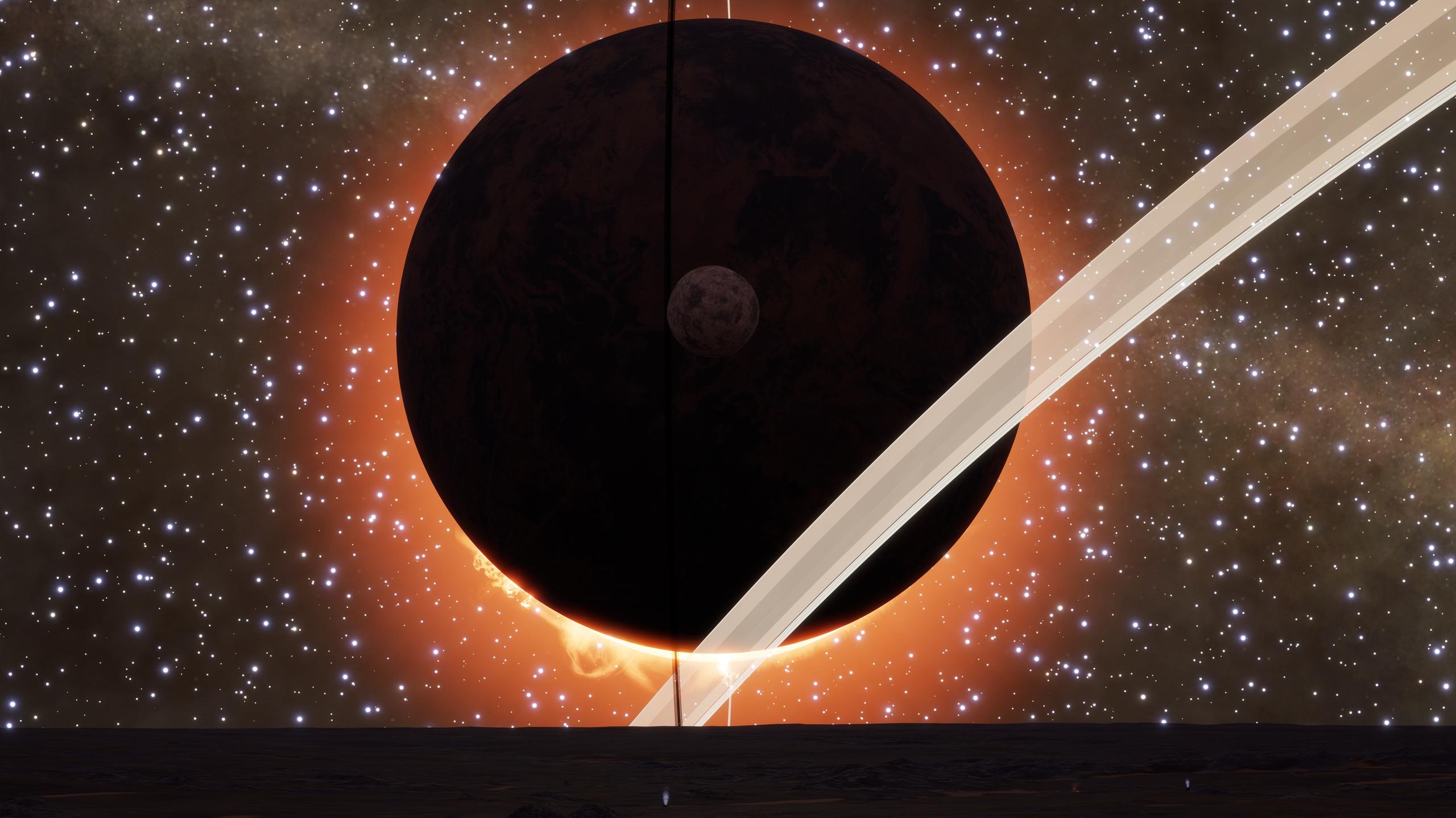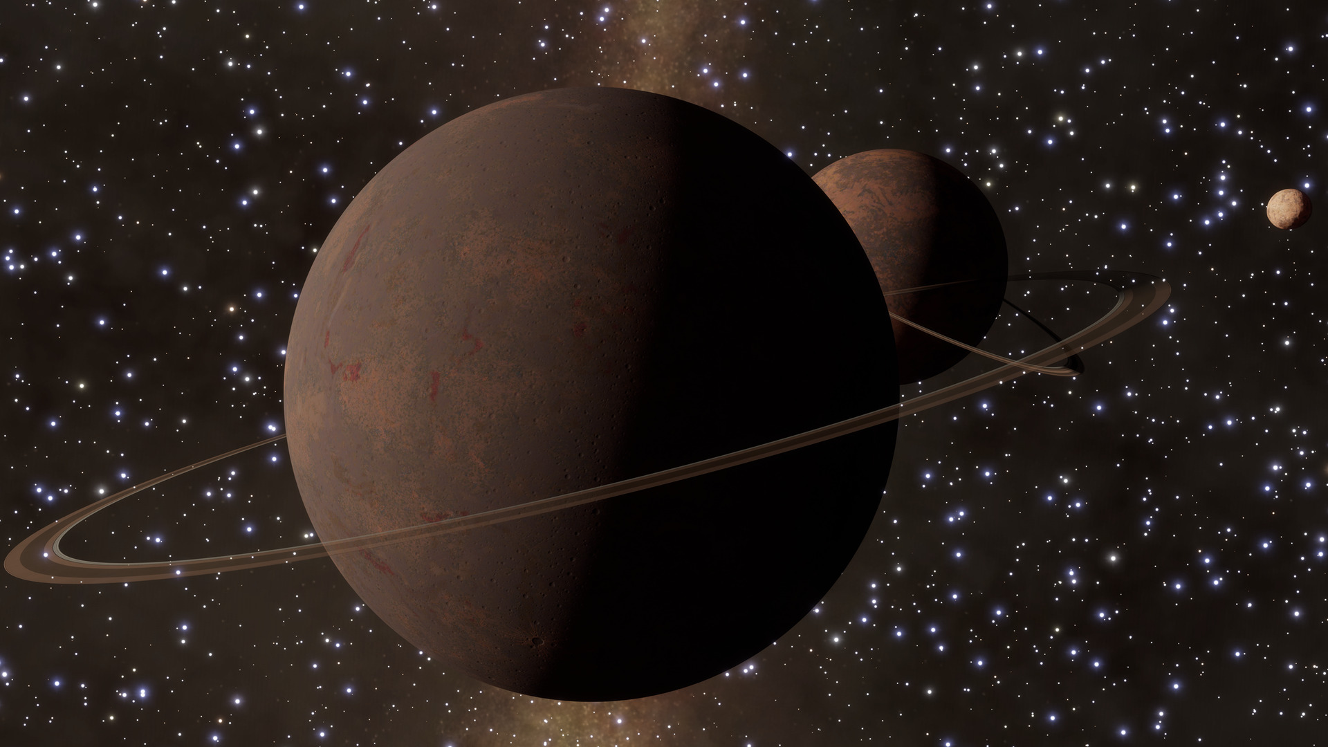 Summary: A system with fast-moving ring structures, hazardous approach zones, and stunning views, between two closely-orbiting Metal-Rich worlds and a small rocky moon passing near one of the rings. | |