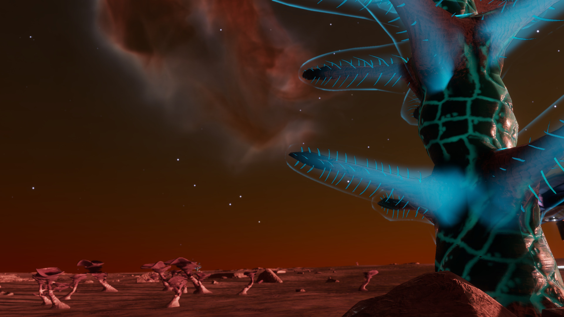 Description: The Statue of Liberty nebula, also known as NGC 3576, was first discovered by John Herschel in 1934. Dr. Steve Mazlin first suggested the nebula's name in 2009 after observing emission clouds within the nebula resembling the North American monument bearing the same name. Explorers on their way here can see the nebula from several hundred light-years away, and several bright stars in the IC 2944 cluster, such as HD 308816 and HD 308813, are visible as well. The landmark system for this Point of Interest is not spectacular in and of itself, though Bacterium Aurasus colonies grow on the surface of the second planet. However, as with other nebulae, explorers will find unique exobiological lifeforms in this region: Electricae Radialem are known to grow within about 100-150 light-years of a nebula, on icy bodies that have thin argon or neon(-rich) atmospheres. Bark mounds are also commonly found within 100-150 light-years of certain nebulae, such as this one. Their growth depends upon active volcanism on a planet's surface. Exobiologists can also find more common exoflora, such as Fonticulua Campestris and Bacterium Acies, in systems within and near the nebula. | |