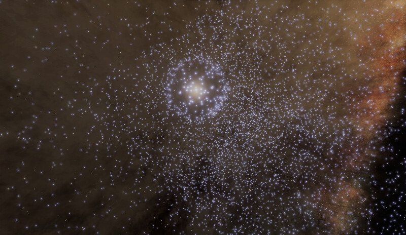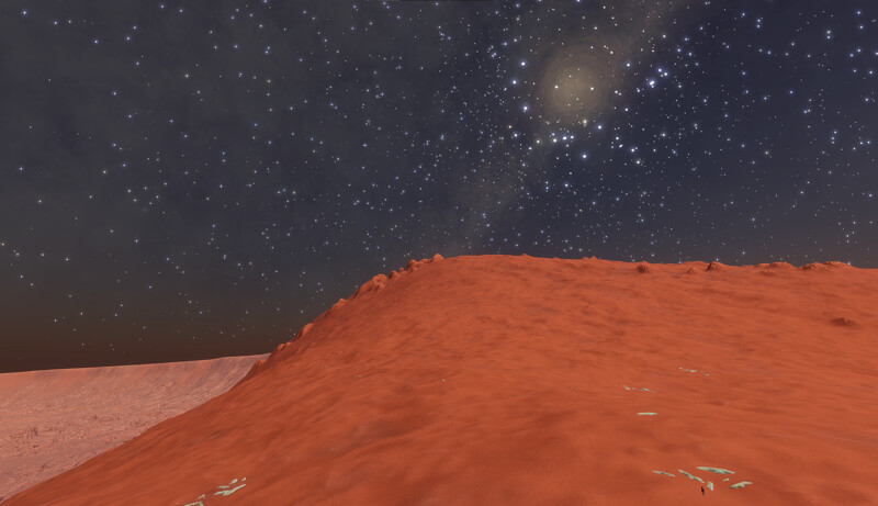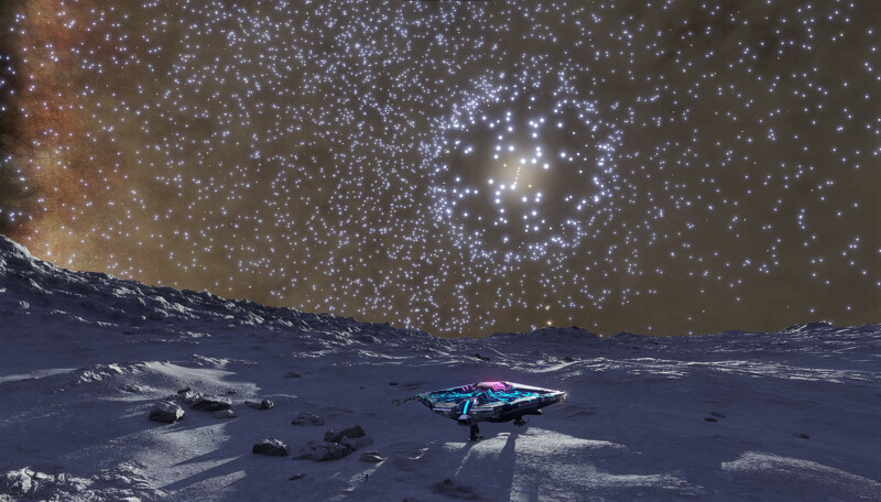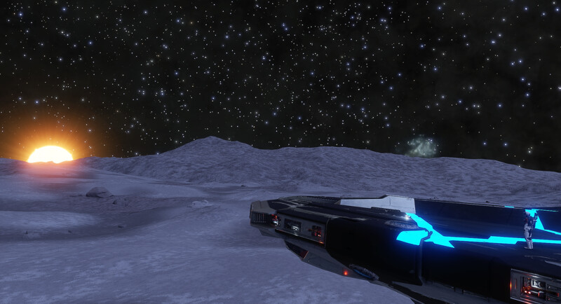 Description: This system houses four black holes, and the highlight is that three of them are close enough to each other that spectacular gravitational lensing effects occur. These are the B, C, D black holes, roughly 130 kls away from the arrival point. Eight dwarf stars orbit the shared barycenter of this trio. However, the complex interplay of lensing effects of the three black holes somehow amplifies light to such a degree that the Dandelion Anomaly can shine even brighter from the surfaces of the nearby bodies than the dwarf stars do. For example, compare these two images, shot at the same site (on A 2 a): The lensing effects it generates, combined with the star density of the surrounding volume of space, can produce good views throughout the system. There are numerous landable bodies here, from which explorers can observe the black holes. There is even some surface life to be found: Stratum Paleas on the BCD 5 f moon, as well as Bacterium Informem on three other bodies. | |