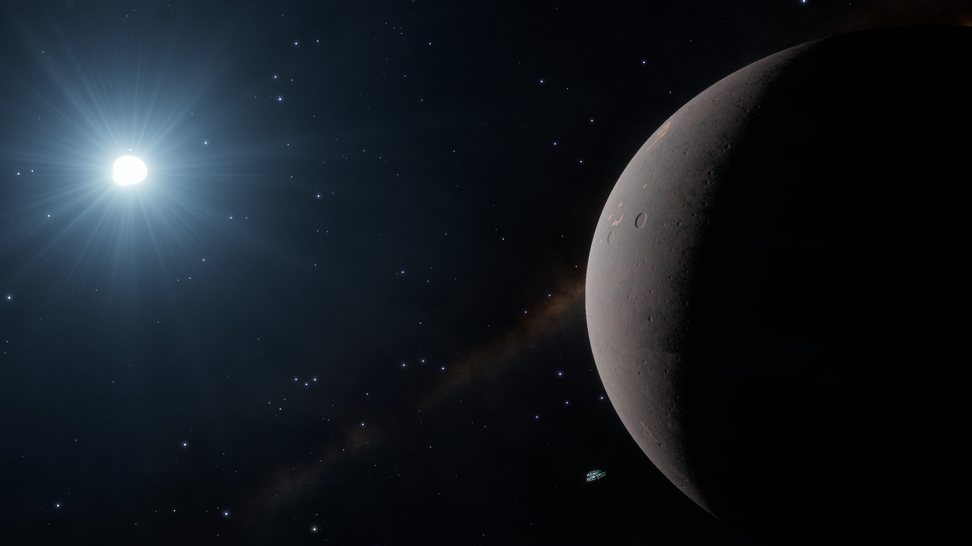 Description: Nyauthou WO-Z is a trinary system with B- and A-class stars locked in a close orbit about 4,600 light-seconds from the system primary. Body BC 1 orbits about 250 light-seconds from the binary pair, whose radiation broils the surface at up to 1,581 Kelvin.