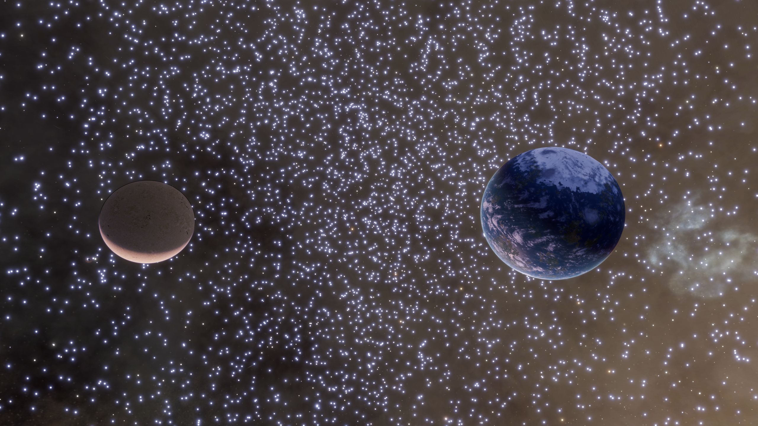 Description: A black hole, orbited by a brown dwarf star, orbited by a blue Earth-like moon, orbited by a thin atmospheric nested moon. As of 3308. May, this system is the only known example of such a configuration: thirty other atmospheric nested moons are known, but their atmospheres are all too thick for them to be landable. The nested moon 1 c a has a Sulphur Dioxide atmosphere and major Silicate Vapour geysers, and while there is life to be found here, the surface gravity (at 0.31 g) is too high for anything other than Bacteria and Strata to be present. In such orbital configurations, the parents tend to be much closer to their moon(s) than usual, so down from the surface, they appear large on the sky: Normally, explorers would see such Earth-like planets as blue and green, but as this system is bathed only in the dim red light of an L dwarf star, the green lands appear as a shade of brown instead. Even the day sides of the bodies are not much brighter than their night sides. There are also a number of other moons farther away from the dead star that have thin atmospheres of various kinds as well, but their surfaces are so cold and dark that only Bacteria survive on them. | |